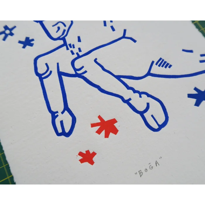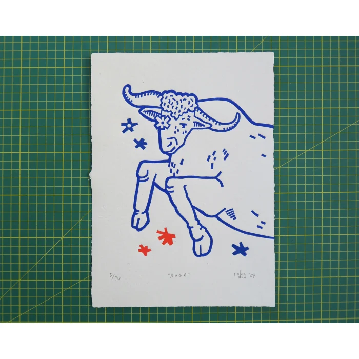 * Two color linocut print on recycled handmade paper.