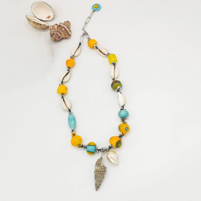Produced using glass obtained from seashells, it offers a unique design; The natural beauty of glass seashells is reflected in each piece with a unique touch; Enriched with cultured pearls, this necklace combines elegance and aesthetics;