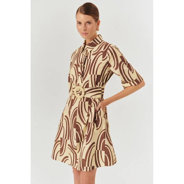 Product: Abstract Patterned Buckled Belt Detailed Cotton Shirt Collar Regular Dress