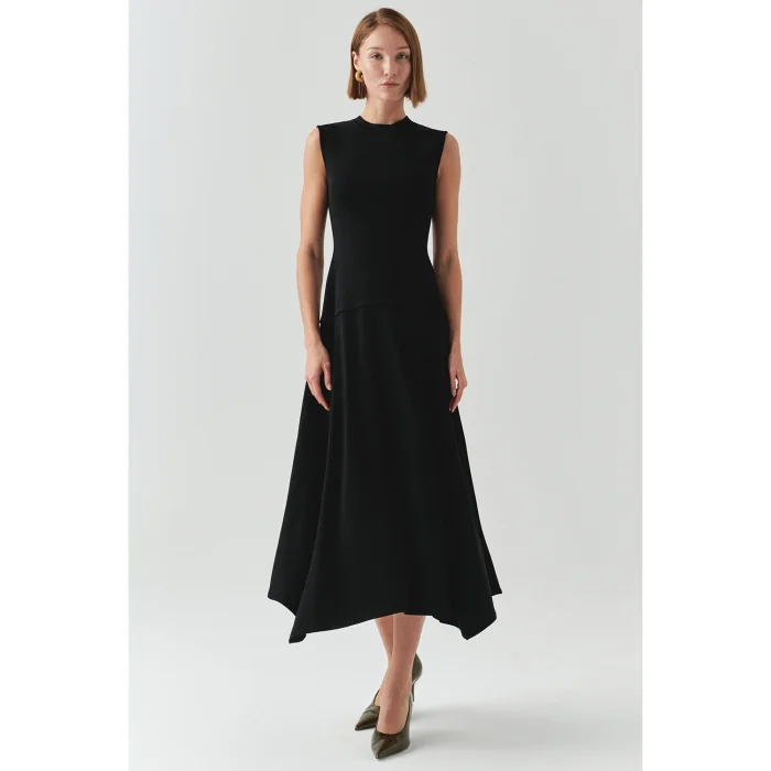 Product: Crew Neck Knitwear Garnished Asymmetric Cut Slim Fit Midi Dress
