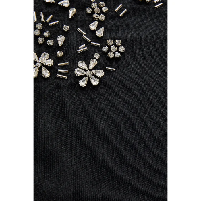 black V-neck cotton regular knitted t-shirt with embroidery details draws attention with its design that offers a sophisticated and elegant look. The V-neck cut highlights the neck area and provides a modern and stylish stance. The asymmetrical stone embroidery in the chest area, combined with floral patterns, creates an eye-catching detail. Thanks to its soft and breathable cotton fabric, this t-shirt offers comfort all day long and is ideal for those who want both comfort and elegance together. While it offers comfortable use by adapting to the body with its regular cut, it can be completed with different combinations from day to night thanks to its stylish details. Standing out with its special workmanship, this t-shirt will be a powerful piece that complements your modern and elegant style.