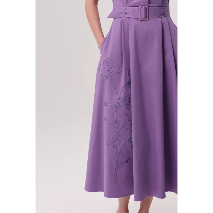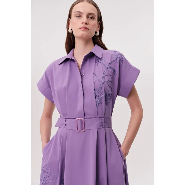 This regular fit midi lilac dress with shirt collar, short sleeves, belt and pockets adds an elegant and feminine touch to the wardrobe of stylish women. With its shirt collar design, comfortable short sleeves and matching belt at the waist, it combines both classic elegance and modern lines. The noble tone of the lilac color emphasizes elegance and stylish stance, offering a modern and sophisticated look in any environment. On the left side of the dress, delicate floral embroidery extending from the waist down adds a unique and romantic atmosphere to the design, while the belt that emphasizes the waist highlights your silhouette and allows you to show a stylish stance. This dress, which you can easily choose for your daily use in the office, at a meeting with your friends or at your special events, gains functionality with its practical side pockets. This useful detail, which allows you to easily carry your phone, keys or small personal belongings, meets your daily needs without sacrificing your elegance. The dress, which easily adapts to different body types thanks to its regular cut and ideal midi length, offers freedom of movement and promises an elegant and flowing stance. This lilac midi dress, which draws attention with its smooth texture and slightly draped structure, provides comfort and breathability all day long with its fabric that feels like a linen or cotton blend. The quality and elegant stance of the fabric make your style noticeable at every moment. Whether you create a stylish combination with high heels or achieve a comfortable daily style with sneakers, this dress offers effortless elegance and elegance for your style. The buckle of the belt in a light lilac tone and the delicate floral motifs on the dress add a sophisticated detail to the design, making this dress an ideal option for women looking for a timeless style.