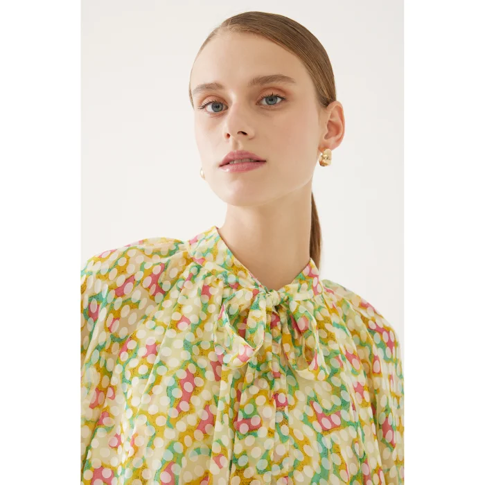 The blouse, which has a light balloon sleeve design, creates a stylish style with its laced collar. It offers an elegant look with its pastel color in yellow tones and shabby cut. The sleeve edges with cuffs match the lacing collar. It is ideal for those who adopt the classic style.