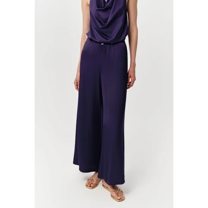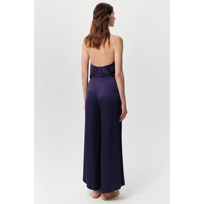 Wide-leg navy blue trousers offer elegance and comfort to your wardrobe. This piece, which attracts attention with its satin-like fabric, creates a stylish alternative for your special occasions as well as for daily use. The trousers, which adapt to different body types thanks to their regular cut, provide a personal harmony with their lace-up waist design. It completes your style with its modern and elegant appearance. The lacing detail at the waist allows the trousers to offer an aesthetic appearance and allows you to easily adjust the waist circumference. The wide leg cut helps you maintain an elegant stance while providing freedom of movement. Its satin-look fabric creates a distinct sense of sheen and flow, adding a touch of sophistication to the pants. This feature also makes the trousers a suitable choice for more formal combinations. It is a suitable alternative for those who prioritize comfort in daily use but do not want to compromise on elegance. These navy blue trousers can be easily combined with various tops and shoes. You can create a casual look with a basic t-shirt and sneakers, or you can achieve an elegant style for special occasions with a stylish blouse and heeled sandals. The lightness and flowing structure of the fabric increase wearing comfort, especially in hot weather. This feature makes the trousers a preferred piece in the summer months. Thanks to its regular fit and wide legs, it offers a look that is both comfortable and in line with current trends. These trousers, which will maintain their place in your women's clothing collection for a long time, can add a sophisticated atmosphere to your style for every season and every occasion. These wide-leg trousers offer elegance and comfort together.