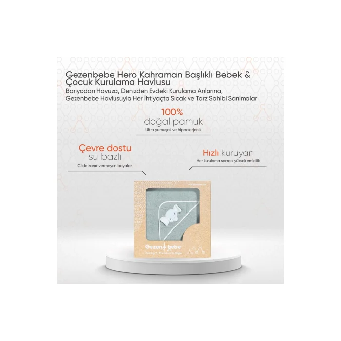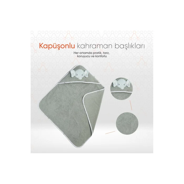 Product Description: Gezenbebe Hero Hero Hooded Baby & Child Drying Towel: Heroes' Warm Embrace, The Cutest Hug After Bath! Gezenbebe Hero Hero Baby and Child Drying Towel with Hero Hood is specially designed to keep your baby warm and dry after bathing. This drying towel, which has an elegant look with pastel tones, is home to the detailed embroidery and touching ears of Gezenbebe's cute heroes, Elephant, Rabbit, Teddy Bear and Koala. The hood is ideal for comfortably wrapping your baby's head and protecting him from cold weather. The iconic Gezenbebe patterned piping adds a stylish touch to the product. With its 100% cotton structure, this extremely soft and breathable towel for your baby's sensitive skin will be indispensable for your post-bath ritual. Salient Features:UNIQUE GEZENBEBE DESIGN: Equipped with cute hero embroidery, this drying towel becomes an indispensable post-bath staple for the little ones. QUALITY COTTON: Thanks to its ultra-soft cotton fabric, our towel offers longevity while protecting your baby's delicate skin. WARM HOOD: The hero embroidered hood keeps your baby's head warm and provides comfort. CUTE AND RELAXING: The unique pattern of the towel soothes the mood of the little ones after bathing. SPECIAL FOR SENSITIVE SKIN: With its hypoallergenic structure, it is ideal for babies with allergies and sensitivities. PERFECT GIFT OPTION: With its unisex and vibrant colors, it is a great gift choice for baby boys and girls. ECOLOGICAL PAINT: Environmentally friendly water-based paint is preferred in the patterns. CUSTOMER ORIENTED: We are constantly improving our products in line with our customers' feedback, focusing on quality and comfort in every detail. Technical Details:Dimensions: 75x80 cmMaterial: 100% natural cottonHigh Water Absorption Capacity: The natural structure of cotton effectively absorbs water, helping baby's skin dry quickly. Color Options: Bunny (Rabbit), Elephant (Elephant), Koala (Koala) and Teddy (Teddy) Care Instructions: Wash at 30 degrees and dry without exposing to direct sunlight. Offering comfort and convenience by gently wrapping your baby's skin, the Gezenbebe Hero Hero Tea Towel with a Hero Hood makes your post-bath moments more special.
