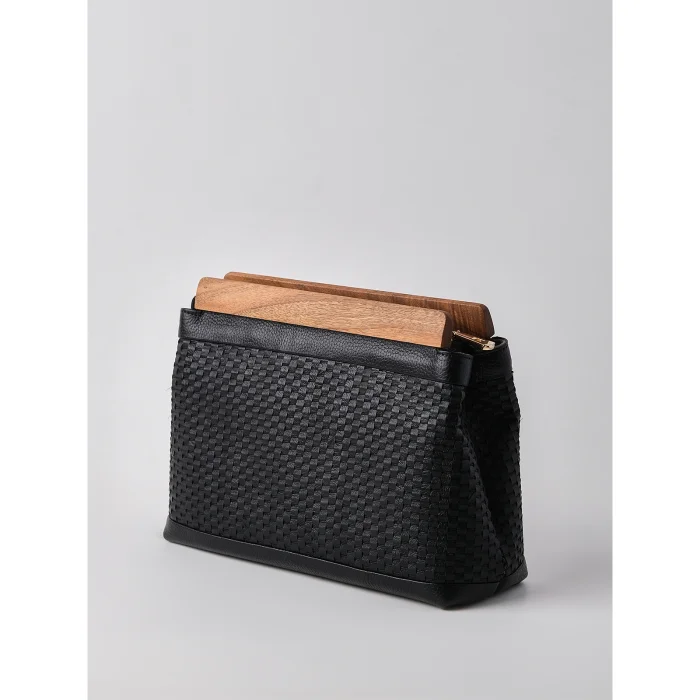 Product: Genuine Woven Leather Clutch Handbag With Wooden Accessories