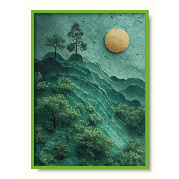 A landscape shaped by layers of jade and a golden sun.