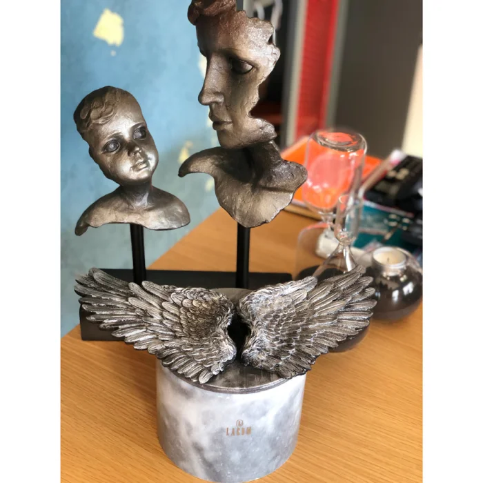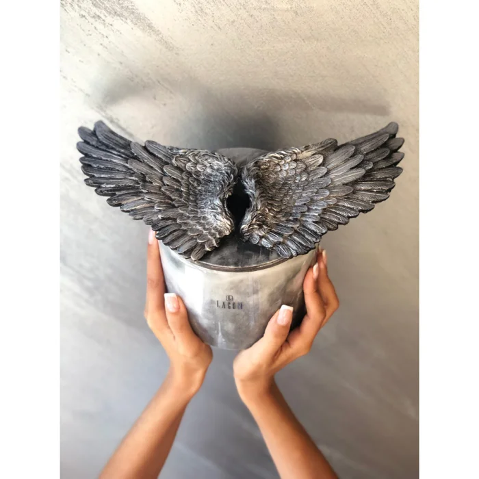 Vanilla, cream color candle. Poliester wings on the wood cover