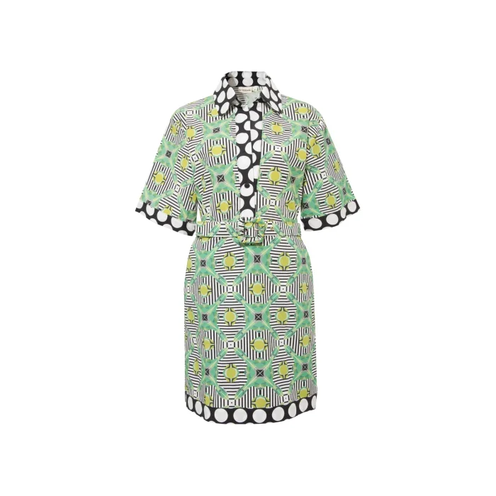 *Patterns are created from the works of Artist Defne Camcıoğlu, *100% Cotton, * The product is carefully designed with fine-textured and tough poplin fabric, considering durability and comfort, * The work, which consists of geometric patterns, was printed on poplin fabric by digital printing method, * The product consists of a short sleeve, short length detailed shirt dress silhouette, * The product, which has a shirt collar, offers a stylish look with its belt detail. CARE RECOMMENDATIONS: * Washing can be done at 30 degrees, *Bleach cannot be used, *Do not dry in the machine." BODY MEASUREMENTS HEIGHT: 90 cm WAIST: 106 cm