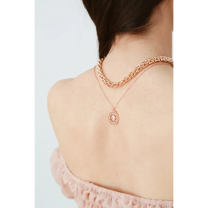 925 sterling silver- 14 carat rose gold-plating. It has BLACK GEMS. Pole& Polestar Medallion Necklace.