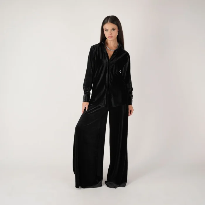 Regular Fit Shirt & Wide Leg Trousers Bottom & Top Black Velvet Set