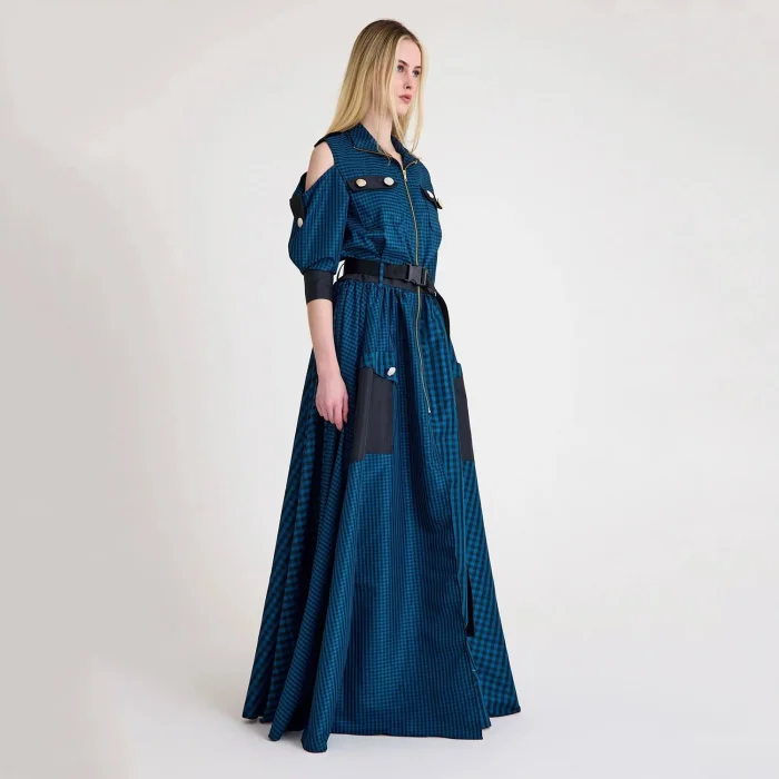 Product: Utility Detailed & Front Zippered Checkered Taffeta Maxi Dress