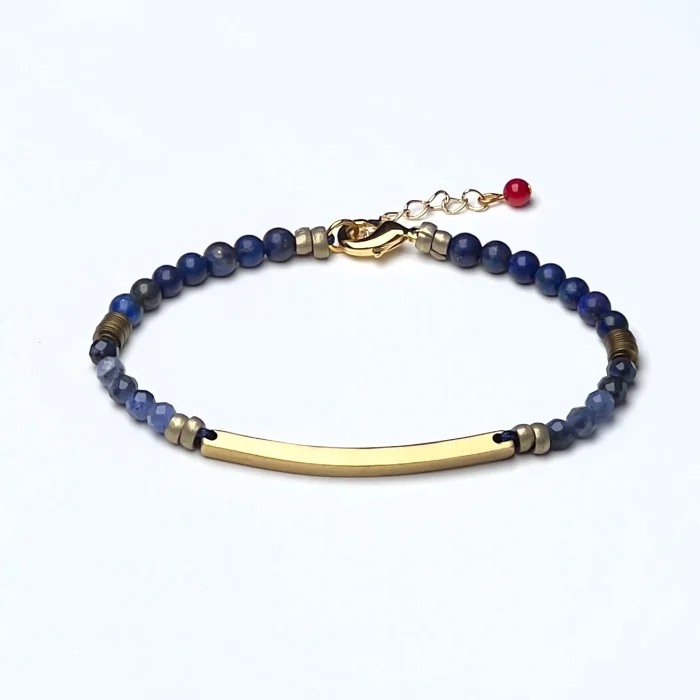 It was designed using lapis lazuli, facet cut blue aventurine, coral, 18k gold-plated adjustable lock, bronze and brass.