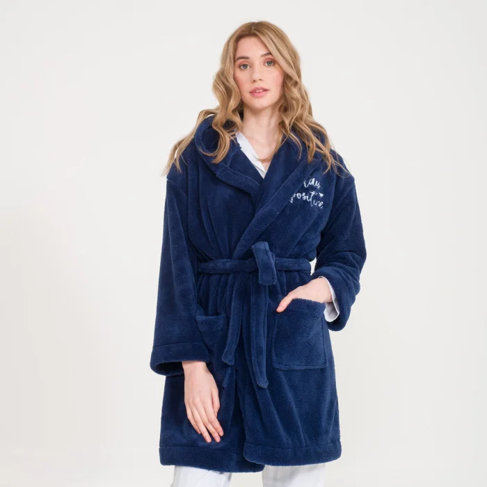 The motto embroidered over-the-knee fleece dressing gown provides a good start to the day.