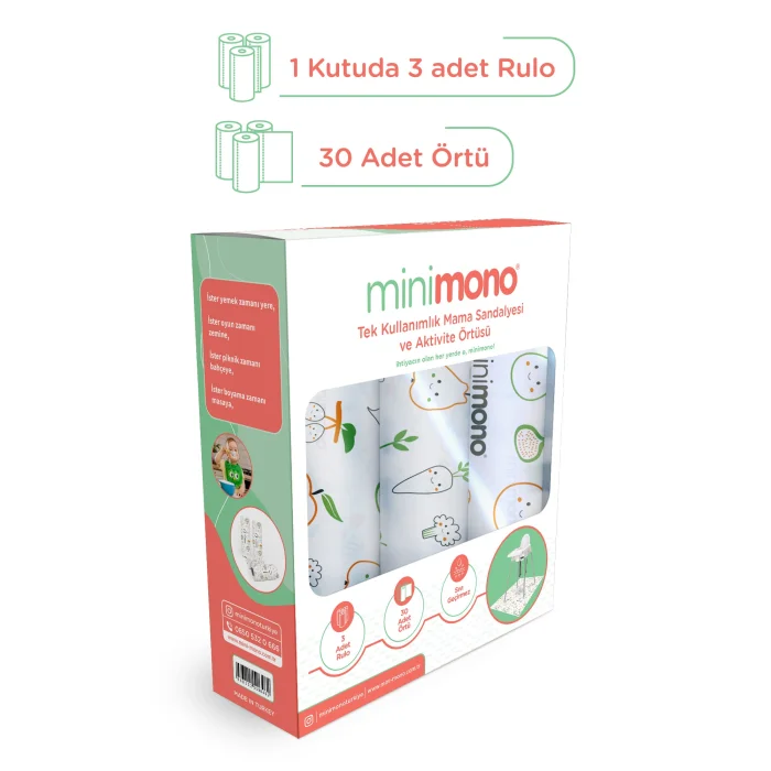 High Chair & Activity Cover | There are 3 rolls in the Fruit & Vegetable Box. ; One roll contains 10 perforated covers. ; Each cover is 100×120 cm in size, protecting the floor during meal and play time! It will be indispensable for all your activities with its practical and liquid-proof surface on the ground at mealtime, on the ground at play time, in the garden at picnic time, and on the table at painting time. ; With its fun designs, the joy of babies is your savior, that minimono!;