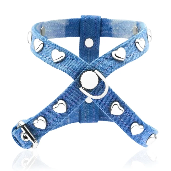 elegantly embellished with shimmering silver-plated hearts on top of ultralight cotton denim fabric. With its light weight, this Harness will be a unique accessory to complement your dog's style on special occasions, while offering a great option for everyday use. You can complete your dog's look with a walking strap adorned with gold-plated hearts of the same color.
