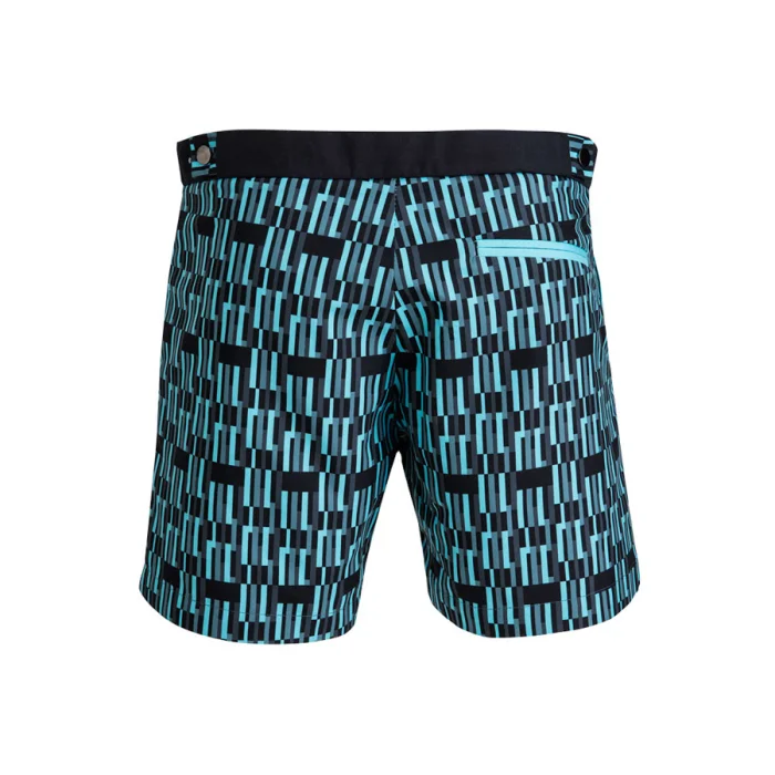 Adjustable side fasteners, bias along side pockets, fleted back pocket, slim fit swimshort