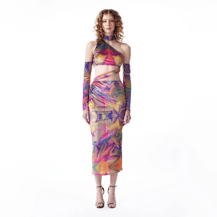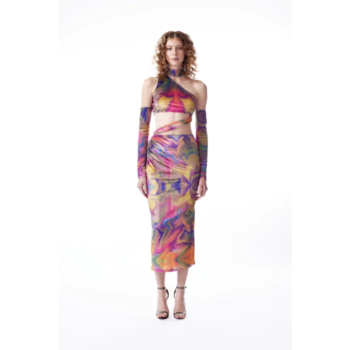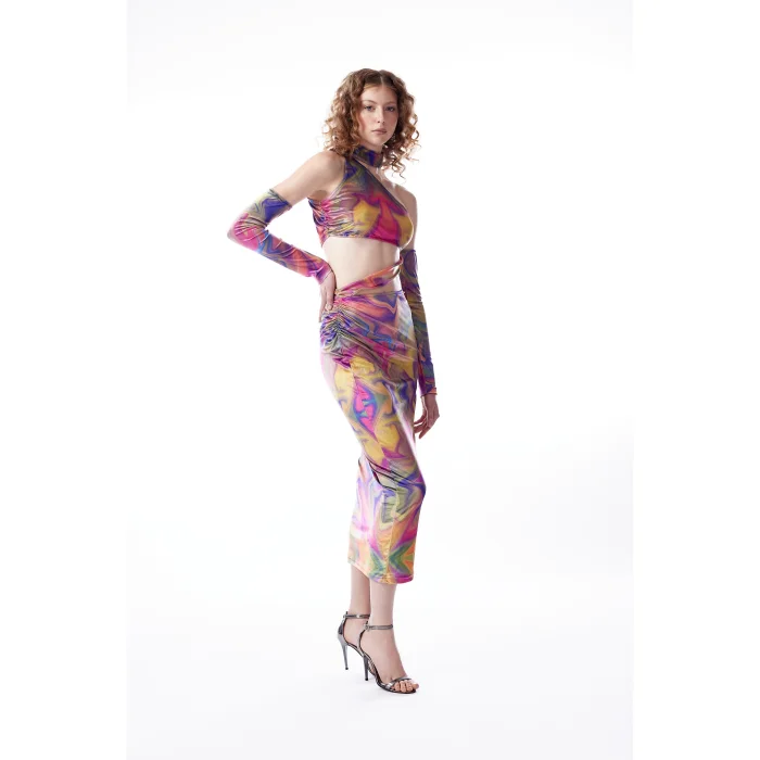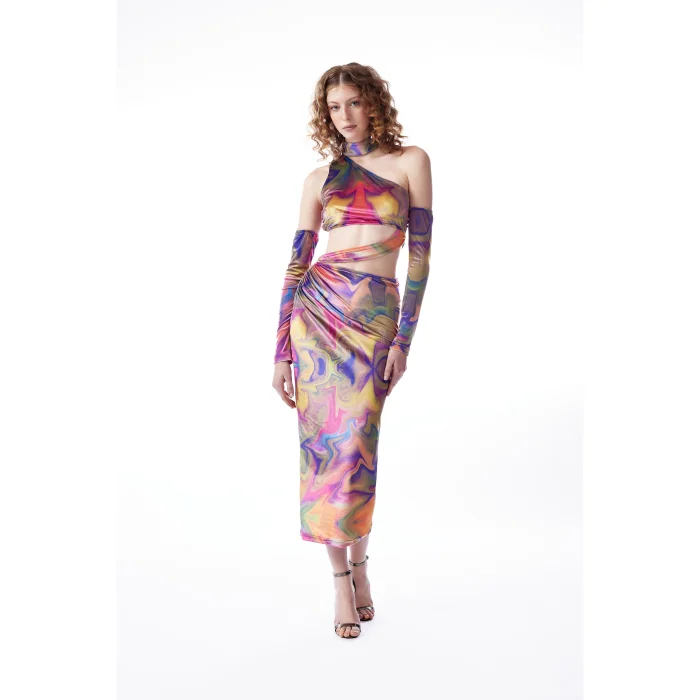 A bold and captivating design! This velvet dress fits seamlessly with the body with its gathered details, creating a modern and feminine silhouette. You can complement it with high heels to attract all the attention at special events. •Luxurious velvet textured fabric •Form-fitting fit with gathered details • Low-cut waist and asymmetrical cut • Stunning and modern design VELVET 91% POLY 9% EA All prints designed for no'design are original and exclusive to our brand. The model is 180 cm tall, has measurements of 82 cm chest, 60 cm waist and 89 cm hips. Size S was preferred on the model because it offers a perfect look with its body-fitting cut.