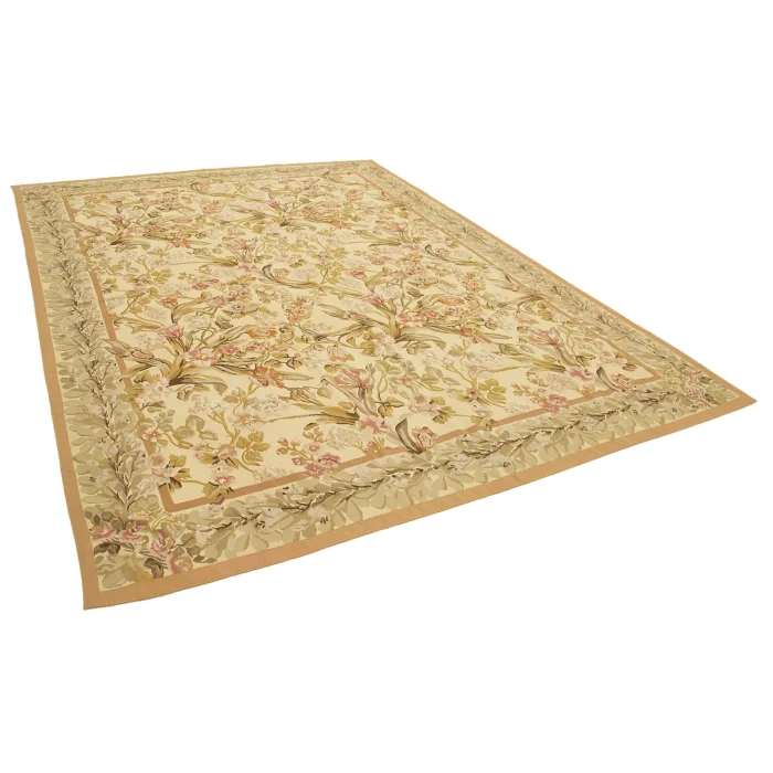 The Aubusson Rug is 266 cm wide by 366 cm long and about 5 mm thick. It weighs an average of 11 kg. It is made with hand-spun wool and cotton. It takes its colors from root dyes obtained naturally.