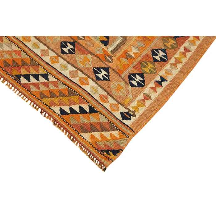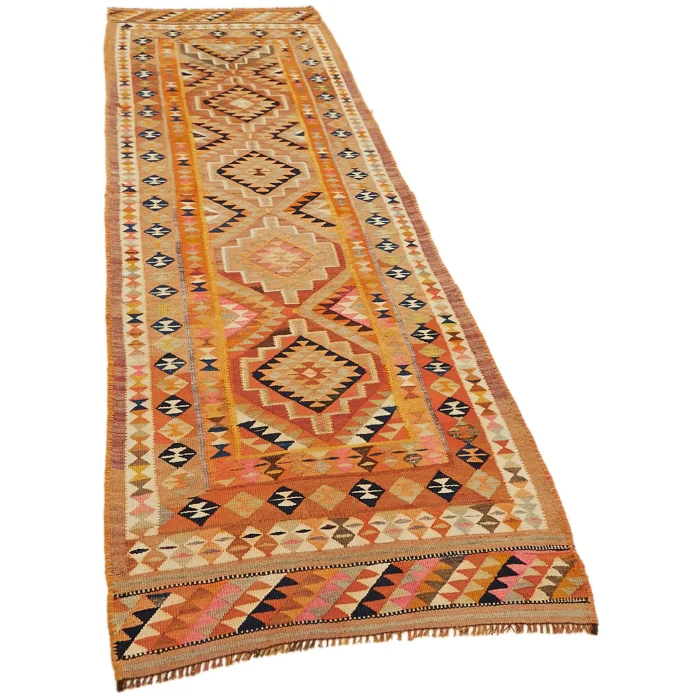 Herki Kilim Rug 97 cm width and 307 cm length and the pile height is 5mm, the approximate weight of the rug is 12 kg. It’s % 100 hand knotted wool and goat hair rug. It’s made from the natural dye.