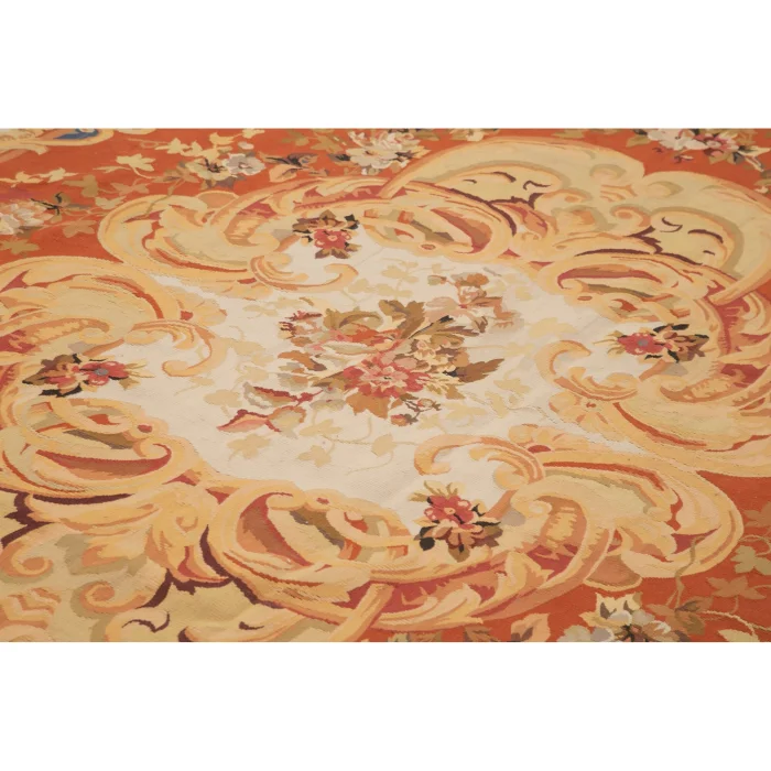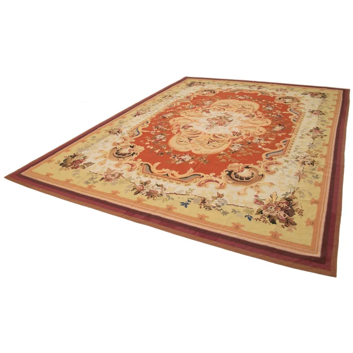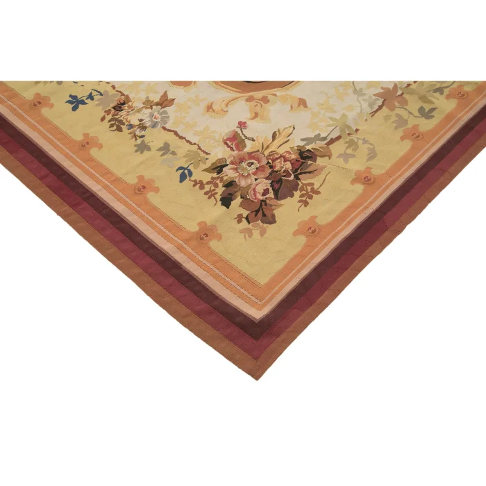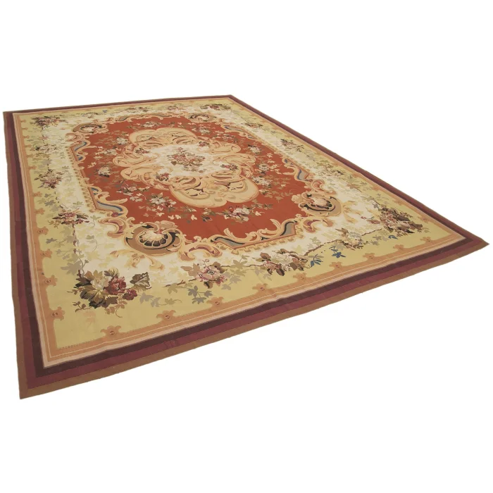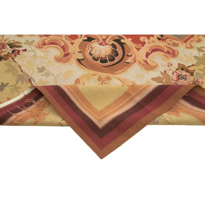 The Aubusson Rug is 304 cm wide by 424 cm long and approximately 5 mm thick. It weighs an average of 15 kg. It is made with hand-spun wool and cotton. It takes its colors from root dyes obtained naturally.