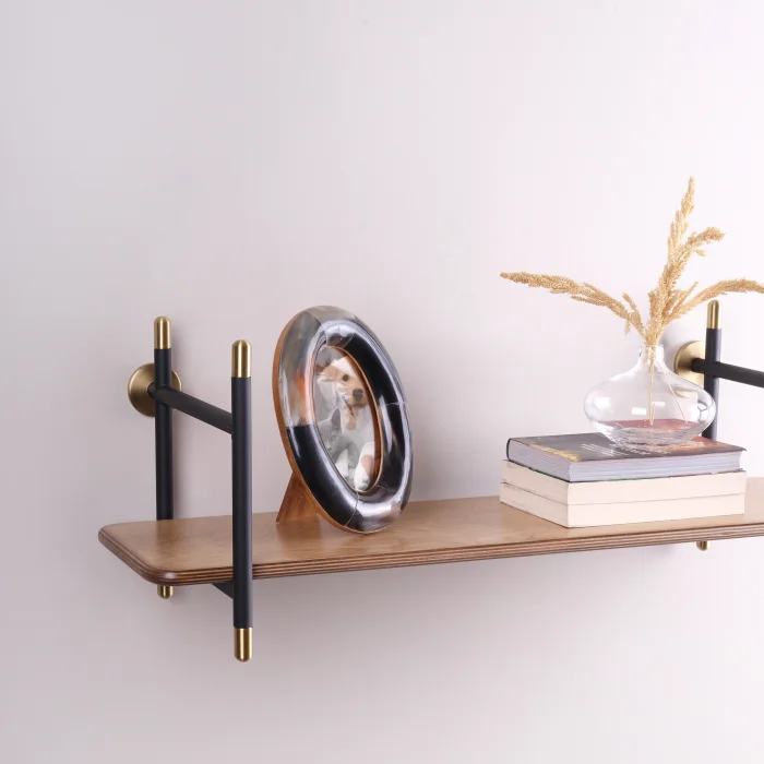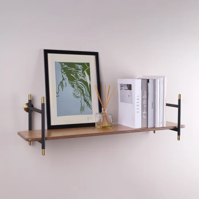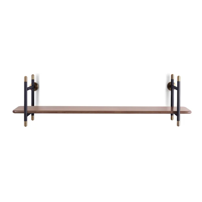 Product Dimensions • 96 cm Wall Shelf: 96 cm x 27 cm h: 27 cm • Wooden shelf depth: 21 cm Highlights • Black and metallic brown alternatives in metal carriers; Walnut and oak options on wooden shelves offer flexibility to adapt to the material palette of the space. • Metal turned elements with tumbled brass finish reinforce the material character of the design. • The metal carriers also have a book holder function, creating a tidy appearance. • The shelf depth of 21 cm creates a minimal projection in the space and provides enough space for objects and books. • It can be mounted on the wall at any height, allowing for different usage scenarios. Technical Information • Metal Parts: Made of solid iron and profile. It is powder coated in black or metallic brown color. • Turned Parts: Made of solid iron. It has an aged brass color finish. • Wooden Shelf: Made of birch plywood, a durable material with a layered structure. It is colored in oak or walnut tones. Care and Usage Instructions • Wooden surfaces and metal parts can be easily cleaned with a damp cloth using natural cleaners. • Bleaching chemical products should not be used for cleaning. • Not suitable for outdoor use. Installation • The product is shipped disassembled. • It is designed to be easy to install. • Installation diagram and wall mounting template are included in the package.