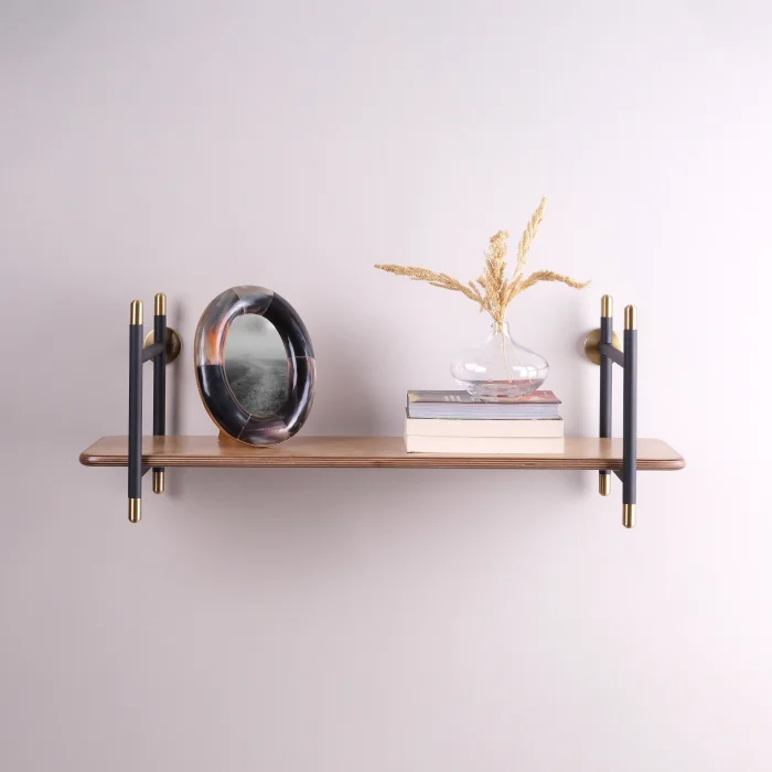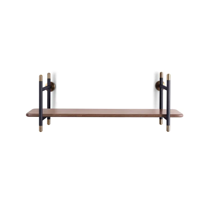 Product Dimensions • 96 cm Wall Shelf: 96 cm x 27 cm h: 27 cm • Wooden shelf depth: 21 cm Highlights • Black and metallic brown alternatives in metal carriers; Walnut and oak options on wooden shelves offer flexibility to adapt to the material palette of the space. • Metal turned elements with tumbled brass finish reinforce the material character of the design. • The metal carriers also have a book holder function, creating a tidy appearance. • The shelf depth of 21 cm creates a minimal projection in the space and provides enough space for objects and books. • It can be mounted on the wall at any height, allowing for different usage scenarios. Technical Information • Metal Parts: Made of solid iron and profile. It is powder coated in black or metallic brown color. • Turned Parts: Made of solid iron. It has an aged brass color finish. • Wooden Shelf: Made of birch plywood, a durable material with a layered structure. It is colored in oak or walnut tones. Care and Usage Instructions • Wooden surfaces and metal parts can be easily cleaned with a damp cloth using natural cleaners. • Bleaching chemical products should not be used for cleaning. • Not suitable for outdoor use. Installation • The product is shipped disassembled. • It is designed to be easy to install. • Installation diagram and wall mounting template are included in the package.