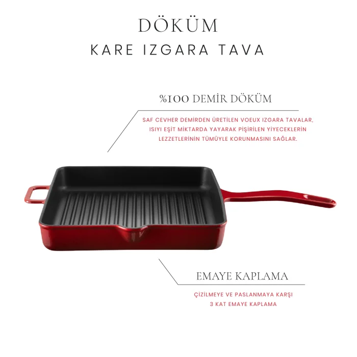 Your food retains its heat for a long time with your Voeux pan The inside of your Voeux pan is covered with durable enamel with high acid and corrosion resistance.The enamel that covers the inside of your pot is not harmful to your health as it does not contain any antibacterial and carcinogenic additives.Your Voeux ceiling, which is 80 percent handmade, preserves its vivid colors for a long time with two layers of special paint.It is environmentally friendly with its production from natural materials and high energy saving feature.With your Voeux pan, you can cook any food you want to cook in the healthiest way using little oil.With the ability of your cast iron pan to go into the oven, you can continue to cook the same dish in different ways.Your pan can be safely washed in the dishwasher. However, if you want your product to be long-lasting, we recommend that you wash it by hand.Your Voeux roof comes with a lifetime limited warranty.*