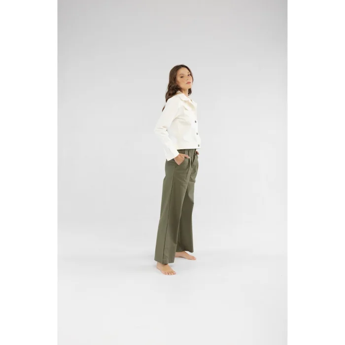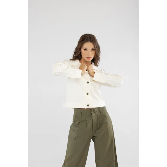 This model, which has a classic denim jacket form, offers a more elegant look with its light cotton texture used instead of denim. It has a simple yet strong stance with its natural softness. Thanks to its form-preserving fabric, it creates a regular silhouette and provides comfortable use all day long. It is an effortless complement to seasonal transitions or layered combinations in the city.