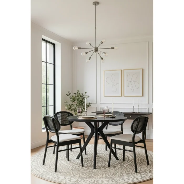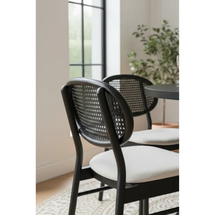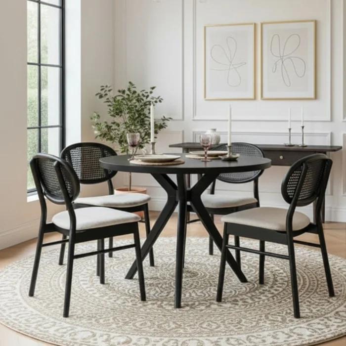 The Beslan black table set adds a sophisticated atmosphere to your dining areas with its stylish and modern Scandinavian design.The 100 cm diameter round table offers long-lasting use with its black natural beech veneer top and sturdy beech wood legs. The 4 chairs in the set are beech wood frame and natural hazeran veneer, providing a comfortable seating experience. Thanks to its minimalist and elegant design, it easily blends with your living room, dining room or workspaces. Cleaning can be done with a slightly damp cloth, and it is recommended to keep it away from sharp alcohol, disinfectants and harsh cleaning products. Beslan black table set transforms your home dining area into both a functional and aesthetic space with its durability and modern design.