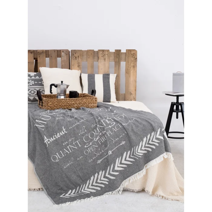 Mountain Magic Sofa Shawl is a stylish and functional piece suitable for use in all seasons with its elegant writing patterns. This shawl, which can be used on both sides, offers a modern look with its black and white contrast. With its soft texture and warmth, it will be indispensable for winter evenings and will add comfort and elegance to your seating areas.