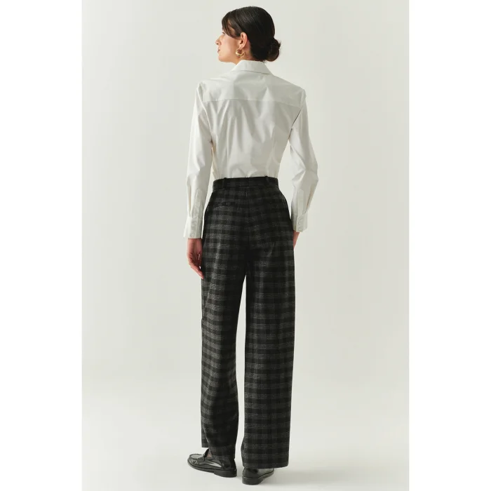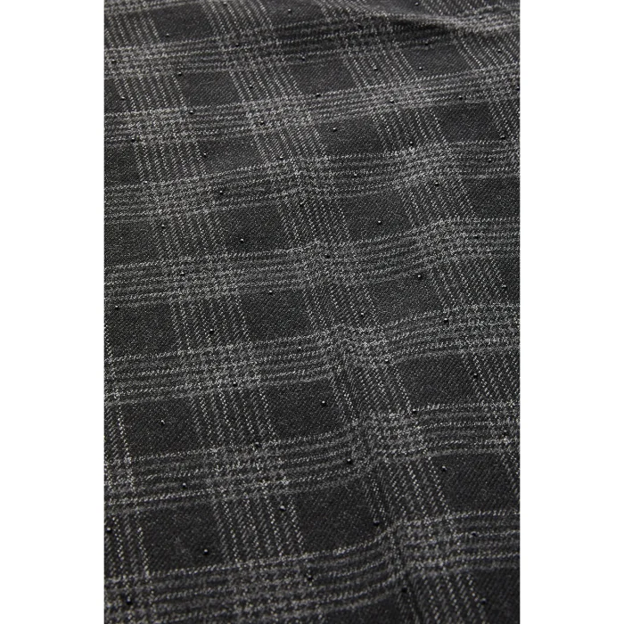 Offering a modern look with its dark plaid pattern, these anthracite trousers add an elegant sparkle with the stone details added to the side pockets; Thanks to its regular cut and pipe-leg form, it adapts to office elegance with shirts and loafers, and to casual comfort with knitwear sweaters and boots.