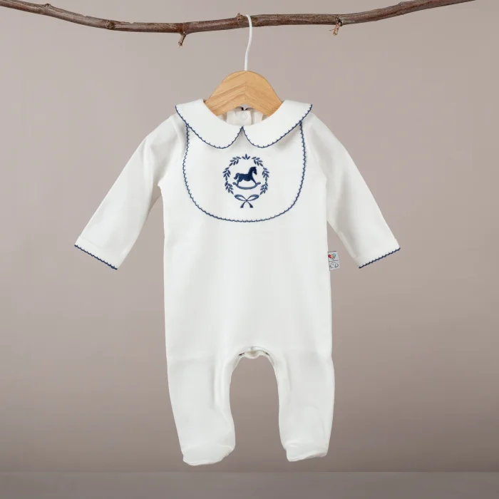Indigo crochet decorated wreathed horse embroidery baby collar apron model, jumpsuit with snaps on the back and bottom