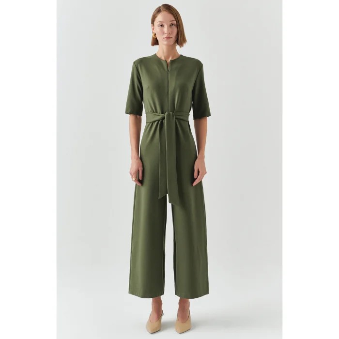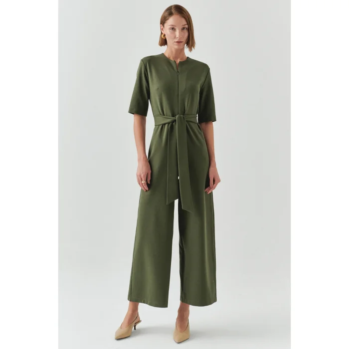 With its soft texture and timeless olive green color, this jumpsuit is a piece that will accompany you at any time of the day. While the belt at your waist creates a special silhouette for you, it never puts comfort in the background with its short sleeves and spacious cut. Whether during a coffee break or dinner... Add some heels and your light will come out along with your self-confidence.