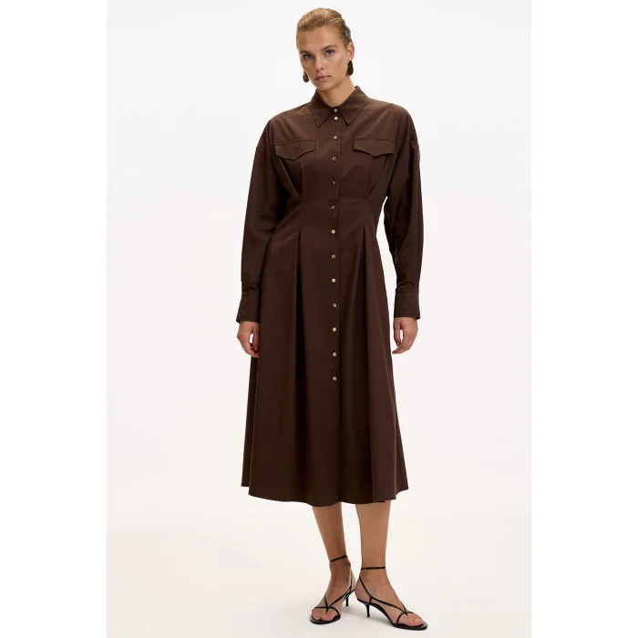 Product: Shirt Collar Long Sleeve Pocket Regular Buttoned Midi Dress