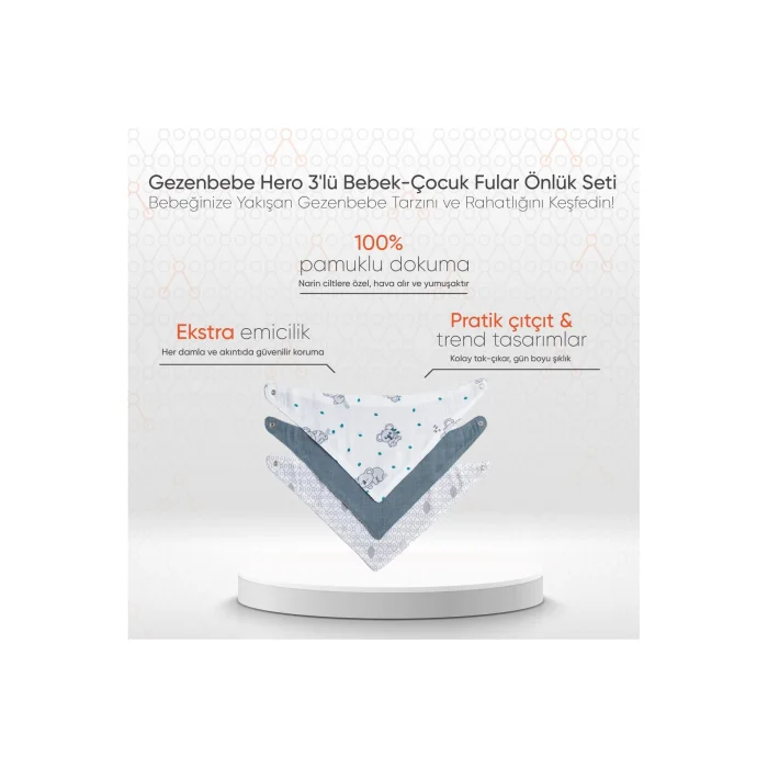 Product DescriptionGezenbebe Hero 3-Piece Baby-Kids Scarf Bib Set: Gezenbebe Scarf Aprons for Little Heroes' Stylish Moments! Gezenbebe Hero Baby Children's Scarf Bib Set brings together both the style and comfort of your little ones. This particular set consists of a scarf-shaped apron with three different designs. While it offers a soft touch to your baby's delicate skin with its pastel muslin fabric, the iconic Gezenbebe patterned cotton fabric adds a unique elegance for stylish little ones. The star of the set is undoubtedly the apron made of muslin fabric with the pattern of Gezenbebe's cute heroes, Elephant, Rabbit, Teddy Bear and Koala. These aprons, which offer a practical use thanks to their triangular scarf-shaped design, can also be easily attached and removed with their snap structure. For parents who are looking for a design that is both functional and stylish, this special set from Gezenbebe is the perfect choice to spice up the daily life of babies. Salient Features:GEZENBEBE SIGNATURE: A unique touch to your baby's style at feeding times with the iconic Gezenbebe pattern and beloved heroes. PREMIUM COTTON FABRIC: Thanks to its 100% cotton breathable fabric, it offers the softest touch to your baby's delicate skin. It provides maximum protection against mouth discharge with its extra absorbency. HEALTHY FABRIC: We always think about the health of your little ones with its antibacterial and antiallergic properties. FUNCTIONAL DESIGN: It offers ease of use with its snap design; While using it as an apron, it also has the elegance of a scarf. ORIGINAL PATTERN: Your baby's joy is always with you with modern and cute patterns. UNISEX STYLE: Unisex style and trendy pattern options for both girls and boys. WATER-BASED PAINT: Water-based paint is used in prints only considering the health of your baby. CUSTOMER FOCUS: We evaluate customer feedback for the sake of quality, harmony and comfort, and we handle every detail meticulously. Technical Details: Fabric: 100% cottonColor Options: Bunny (Rabbit), Elephant (Elephant), Koala (Koala) and Teddy (Teddy) Care Instructions: Wash at 30 degrees and dry without exposing to direct sunlight. Complete your baby's daily adventures with elegance with the Gezenbebe Hero 3-piece Baby-Child Scarf Bib Set; Let this special set, which meets both health and style, be your best choice for your little ones!
