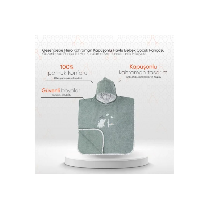 Product DescriptionGezenbebe Hero Hero Hooded Towel Baby Kids Poncho: It's Time to Dry Off with Heroes! Gezenbebe Hero Hero Hooded Towel Baby Kids Poncho is specially designed for your little heroes. This poncho in pastel shades will wrap your baby around and give you a soft hugging feeling. It offers a warm embrace after bathing with the detailed embroidery of Gezenbebe's cute heroes, Elephant, Rabbit, Teddy Bear and Koala, on its hood. Its piping, embellished with the iconic Gezenbebe pattern, makes this poncho not only a functional but also a stylish accessory. With its 100% cotton structure, it does not irritate the skin, absorbs water quickly and shortens the drying time. It's an ideal option for families looking for post-bath comfort and style!" Prominent Features:ORIGINAL GEZENBEBE SIGNATURE: Put your baby's signature on your baby's style with Gezenbebe's unique heroes and iconic pattern. HIGH QUALITY FABRIC: Gezenbebe Hero Hero Hooded Terry BabyChildren's Poncho guarantees your baby's comfort with its breathability and ultra-softness. UNIQUE DESIGN: Its cute and unique protagonists soothe your baby's mood while also adding originality to it. MULTIFUNCTIONAL USE: Not only ideal for daily use, but also for beach and after-pool. SPECIAL FOR SENSITIVE SKIN: With its hypoallergenic properties and easy washability, it is suitable for all skin types, especially ideal for babies with sensitive skin. IDEAL AS A GIFT: With its colorful, cute and unisex design, it is the perfect gift option for all babies. NATURAL DYE: Natural and harmless water-based dyes are preferred in prints. ALWAYS THE BEST FOR YOU: Customer satisfaction is at the forefront for us. With your feedback, we are constantly improving our products and striving for excellence. Technical Details:High Quality Material: Made with premium materials that are lightweight, breathable and quick-drying. Baby Friendly: With its 100% cottony texture, it provides maximum comfort and dryness for your baby's sensitive skin. Usage Time: Our ponchos will be a companion that will not leave your baby's side until the age of 5. Unique Color Options: With attractive color and pattern alternatives such as Bunny, Elephant, Koala and Teddy. Care Instructions: Wash at 30 degrees and dry without exposing to direct sunlight. Gezenbebe Hero Hero Hooded Towel Baby Kids Poncho both reflect your style and maximize your baby's comfort. His smile is the most valuable return for us.
