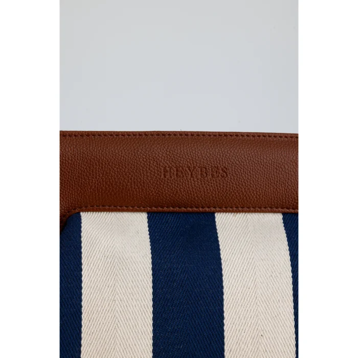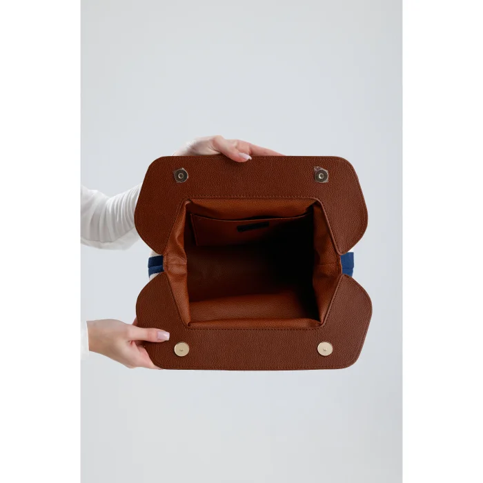 It is made of stripe patterned woven canvas fabric. It is prepared with special hand workmanship. The interior is lined with faux leather and has 1 interior pocket. It has a magnetic cover. 34x23x11 cm (Width x length x depth). Internal volume height: 16 cm, internal volume width: 18 cm.