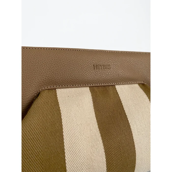 It is made of stripe patterned woven canvas fabric. It is prepared with special hand workmanship. The interior is lined with faux leather and has 1 interior pocket. It has a magnetic cover. 34x23x11 cm (Width x length x depth). Internal volume height: 16 cm, internal volume width: 18 cm.