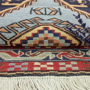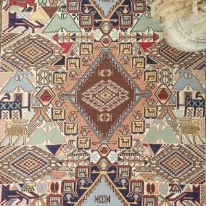 This rug is prepared with sumac weaving technique. Sumac rugs, unlike plain woven rugs, are made by wrapping additional threads on top of warp threads. This technique gives the rug a more durable structure and makes the texture look fluffy and plump. The size of the hand-woven rug is 130 x 207 cm and the thickness is between 1-3 cm. Our rugs, which have local touches, are inspired by the original designs of Iran. Sumac rugs have rich and detailed patterns. It often includes geometric shapes, floral motifs, and stylized animal figures. These designs have a special 2000s style and will add a nostalgic atmosphere to your home.