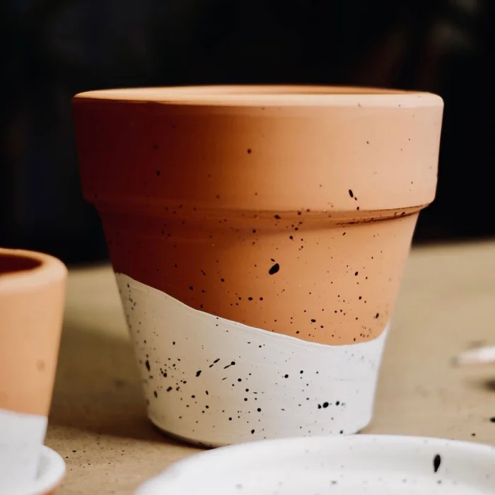 Product: Terracotta Conical Flowerpot + Plate • Black And White Spotted Terracotta Conical Flowerpot + Plate • Black And White Spotted