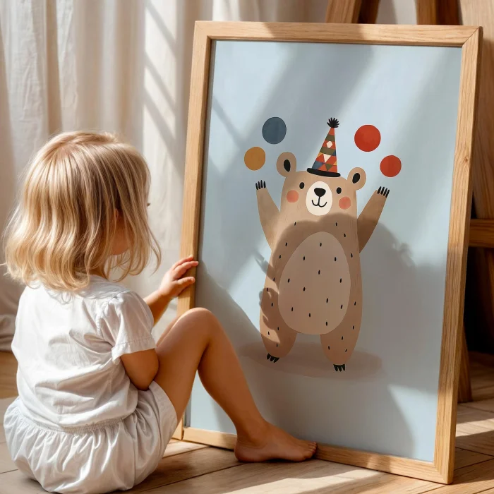 Product: Cute Jonglör Teddy Bear With Blue Background Kids' Room Wooden Wall Art I