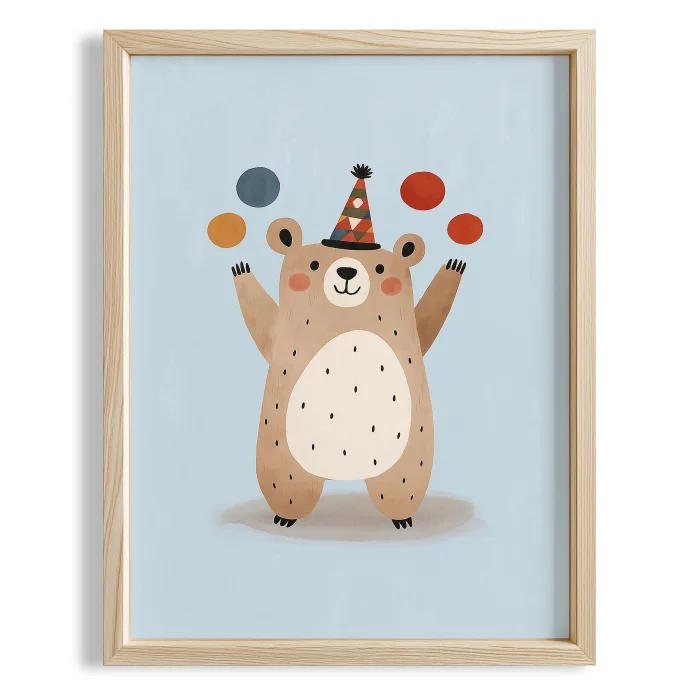 Product: Cute Jonglör Teddy Bear With Blue Background Kids' Room Wooden Wall Art I