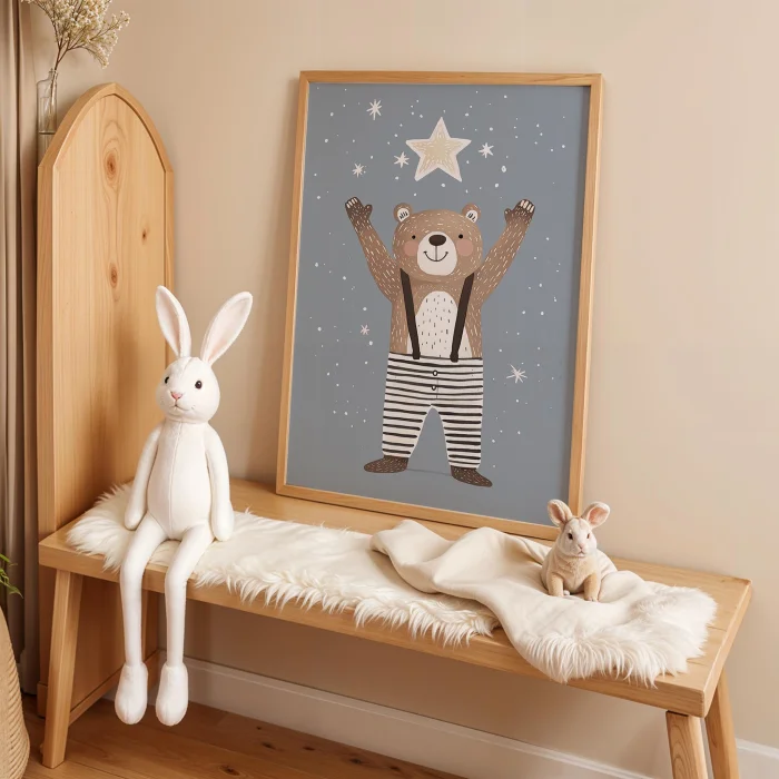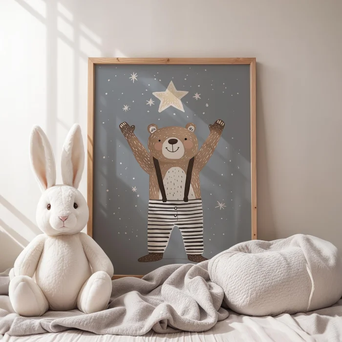 Product: Happy Bear Reaching For Stars Kids Room Wooden Wall Art