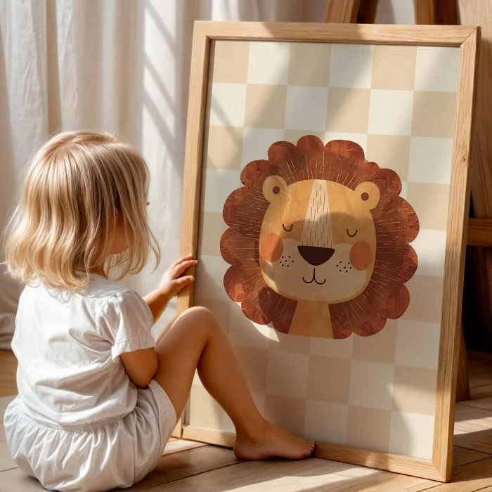 Product: Lion Cute Safari Animals With Cream Checkered Background Kids' Room Wooden Wall Art