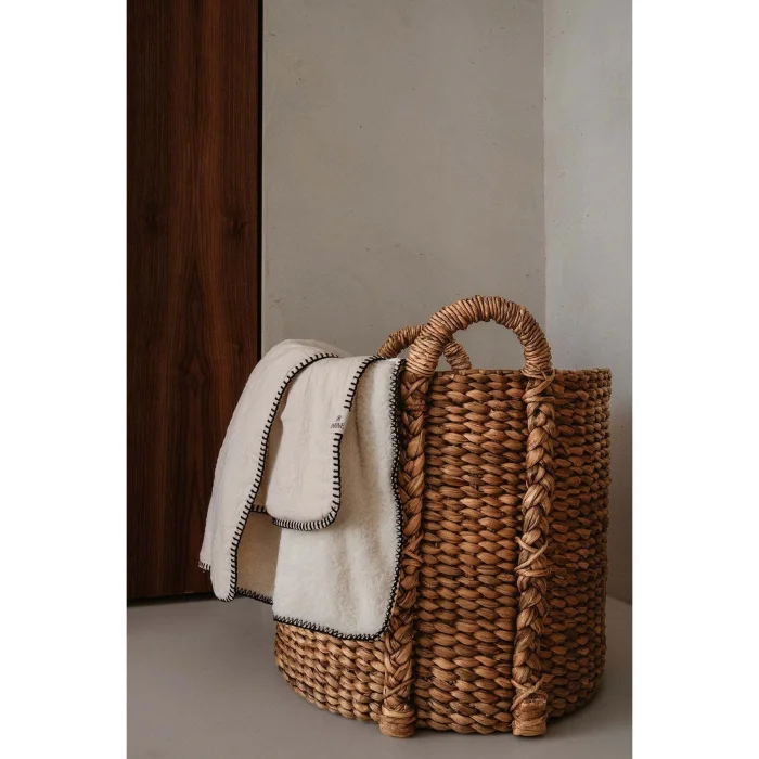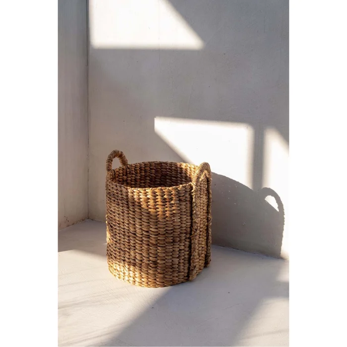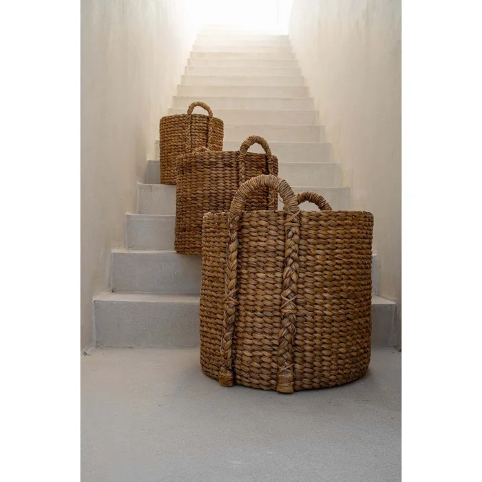 Handcrafted from water hyacinth fiber, this round long-handled basket offers decorative and functional use with its natural texture.; With three different size options: 51x47 cm, 43x41 cm and 33x35 cm, it is ideal for both storage and décor purposes.; While the long handle design allows for easy carrying, it adds harmony to any living space with its rustic elegance.