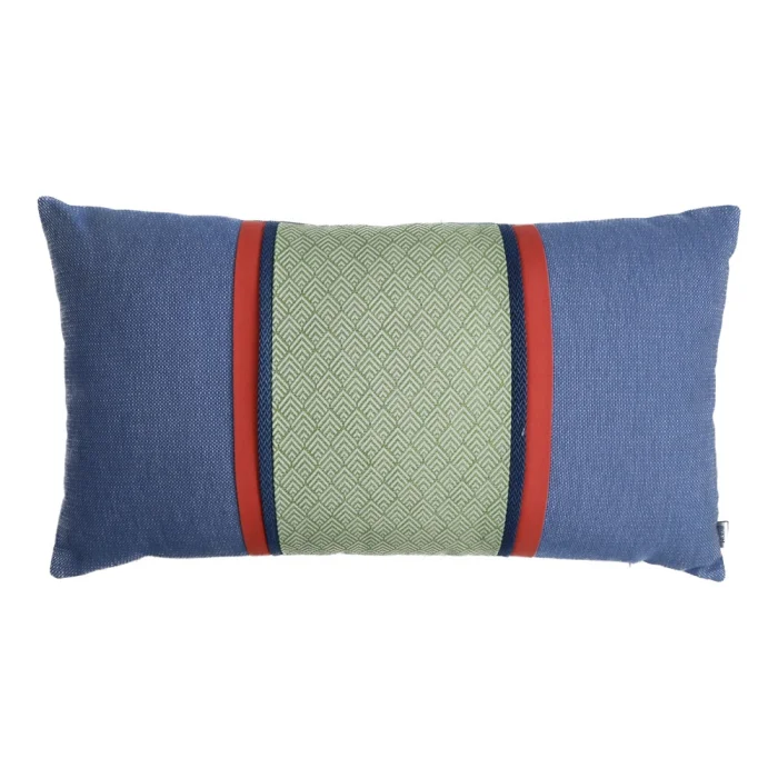 Rectangular, blue pillow with patterned band.