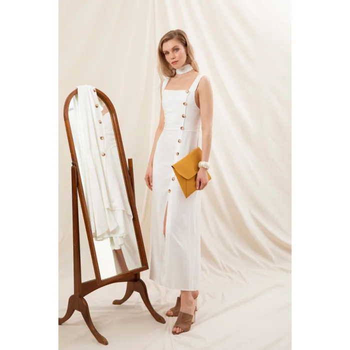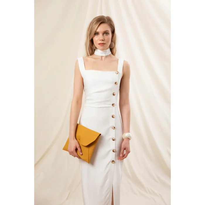 Button Detailed, ankle lenght, apron. Dress pops out of an envelope. PU Leather C-ya Clutch.