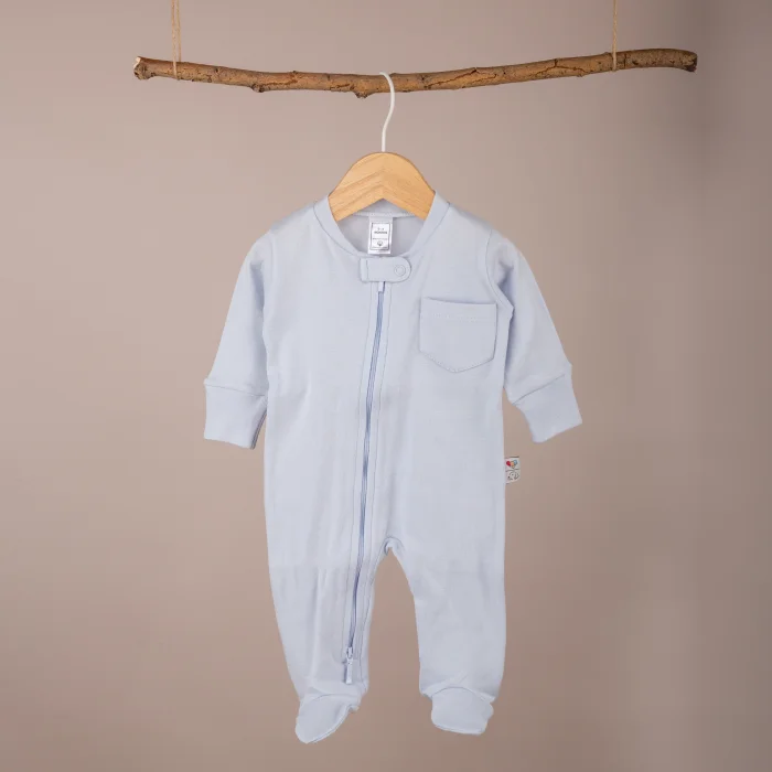 A stylish and functional option suitable for your baby's sensitive skin, the Baby Blue Jumpsuit with Pockets and Double-Sided Zippered Booties stands out with its elegant design and high-quality workmanship. It offers practicality in daily use and nobility on special occasions.