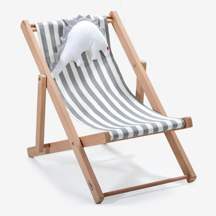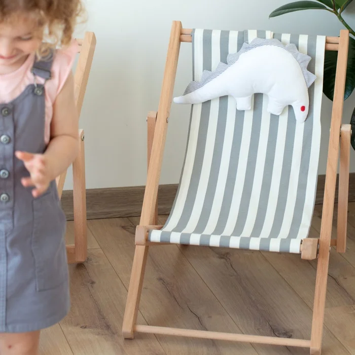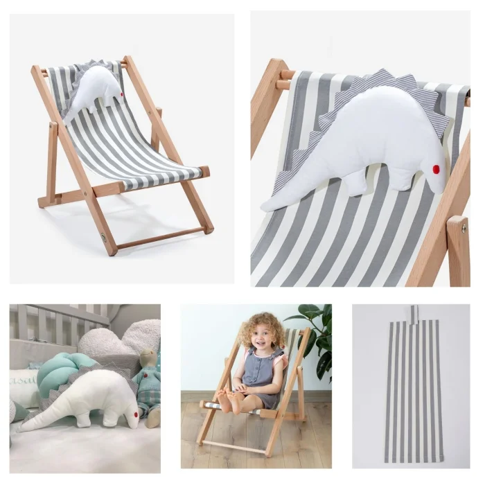 Two-stage solid wood fun natural child lounge seat. Dino pillow and grey-white striped cushion included. You can use our children's chair in both ways, reclining backwards and upright in a sitting position. Open-Close & Disassembled-Mounted. It is an easy-to-carry, practical sunbed type long chair. Mobile furniture, I go everywhere with you. I'm with you at home, at school, on vacation. Frame natural solid wood child seat size, 42.5*64.5*h:59cm. Actual weight 2,7Kgr. Parcel weight 3,8Kgr.Dino pillow is fiber-filled, grey and white spines striped, cotton thread hand embroidery on the eye. Dino pillow toy size, Width 34cm. Height 22cm. Depth 7cm. and 70gr. weight. Child seat cushion grey-white striped - interior upholstery fabric details: Lenght 91,5* Width 32cm./111gr. Product: Natural Child Seat
